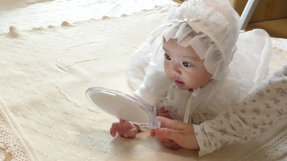 Cute Baby Model Wearing White Baby Dress, Smile and Cooing, Babbling
